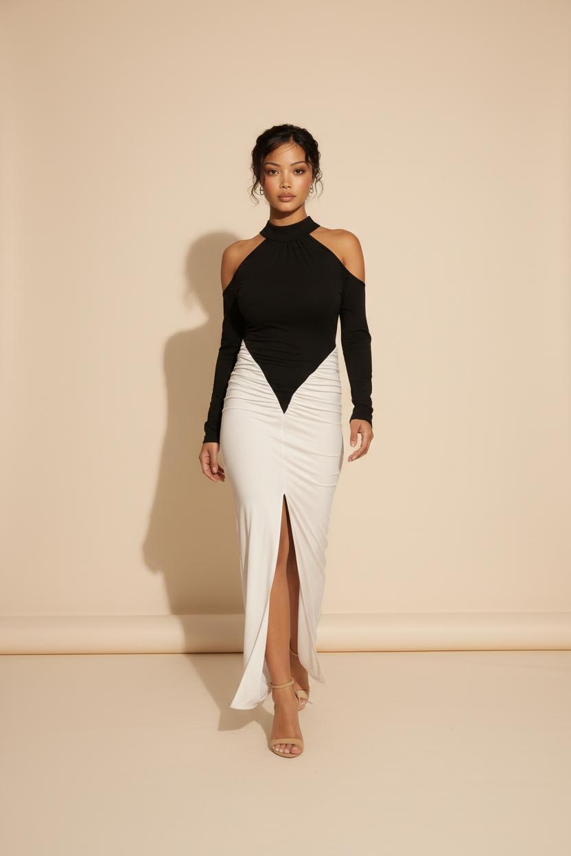 Faites une entrée remarquée avec la robe Lumina, une création graphique qui redéfinit le glamour contemporain. Son design bicolore noir et blanc crée une illusion d’optique sculptante, idéale pour allonger la silhouette.